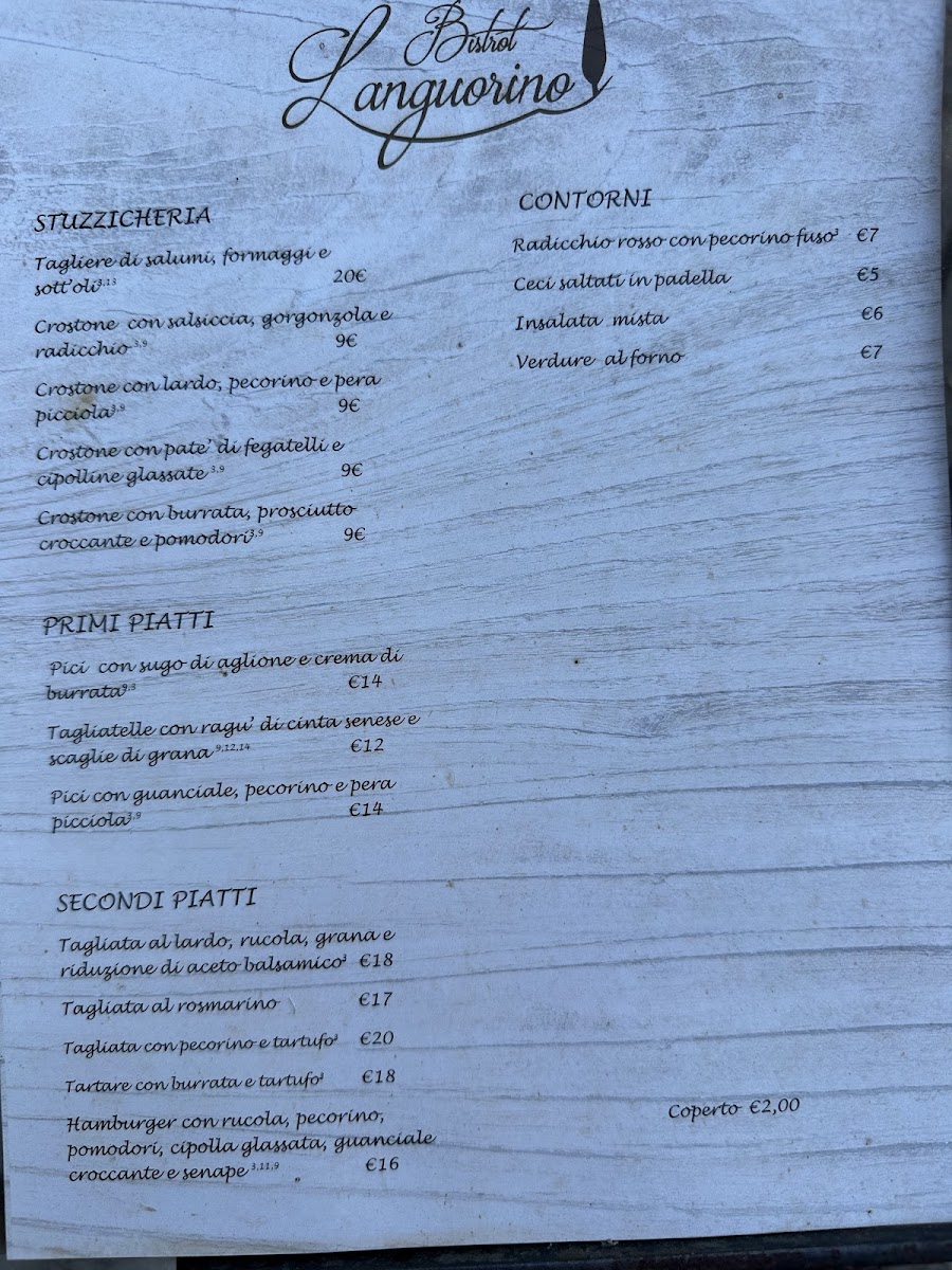 Welcome to Bistrot Languorino, an enchanting dining experience nestled in the heart of Bagno Vignoni, Italy. Our curated menu celebrates the artistry of Italian cuisine, showcasing dishes that captivate the senses. Renowned for our handmade pastas and exquisitely prepared meats, each plate is a harmonious blend of local ingredients and culinary passion.